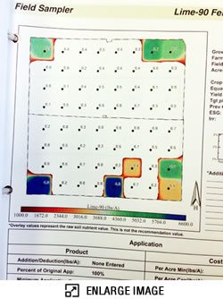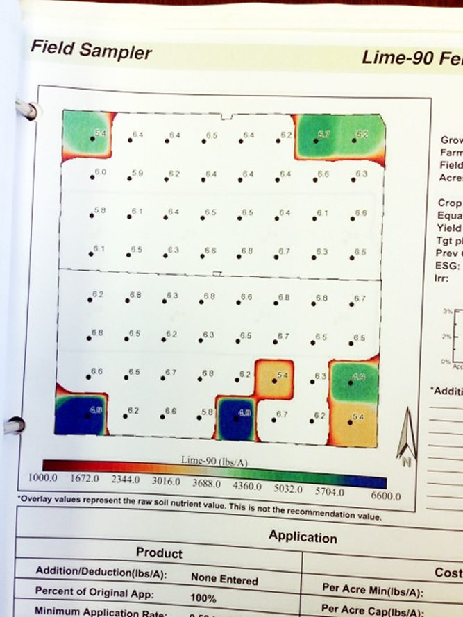 Mr. Wildy has long been a proponent of precision application. Pix worked perfectly with precision application, but recognizing that his Pix use rates do not impact yield and when generics cut the price, he decided to focus his management time on inputs that cost real dollars: seed, fertilizer, and lime. Each of these inputs cost over $50 per treated acre, so the Wildy farm uses intense soil sampling on every 2.5 acre block to create precise application maps. Since lime, P (phosphorus) and K (potassium) requirements do not change dramatically from year to year, soil samples are pulled on a third of the farm every year covering the entire farm every three years. Mr. Wildy considered using soil zones to cut his sampling costs, but a strange observation with lime requirement in pivot irrigated fields convinced him to stick with 2.5 acre blocks. Despite the best agronomic predictions, the lowest pH was in the dry corners – not under the pivot where more nitrogen and water are applied. The cause for this anomaly turned out to be a good slug of calcium in the pivot water, which saves the lime application on 80% of each pivot-irrigated field. (See photo of a lime prescription map for a pivot field.) Neither does Mr. Wildy give up on low productivity areas; he uses precision application to boost yield in poor spots by applying extra organic matter from chicken litter, cover crops, and his own weed free and disease-free gin trash.