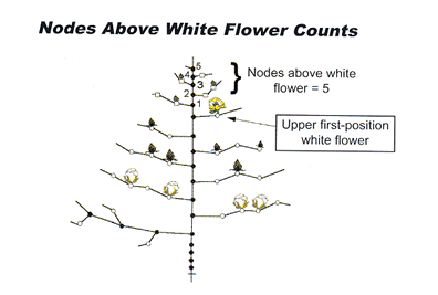 From first flower until cutout, nodes-above- white-flower (NAWF) counts are recorded weekly from ten plants at each of four sites per field.