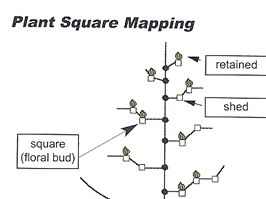 At first square, field stand counts and average first fruiting node number are recorded. From first square to first flower, ten plants at each of four sites in a field are monitored weekly for the presence or absence of first-position squares.