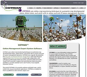COTMAN™ software uses cotton crop monitoring techniques to summarize crop developmental status, detect stress, and assist with in-season and end of season management decisions. It was developed by the University of Arkansas Division of Agriculture with major financial support from Cotton Incorporated and through collaboration with colleagues at Mississippi State University, Louisiana State University, Texas A & M University, Virginia Tech, University of Arizona, University of Georgia, Clemson University, Arkansas State University, and USDA