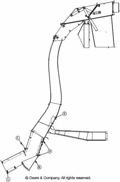 Schematic of main cotton conveying duct used on John Deere 7460 stripper harvesters (Courtesy of John Deere): A – Lower Front Separation Duct Panel; B – Lower Separation Duct Door; C – Door; D – Separator Angles; and E – Vanes.