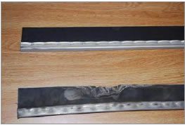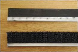 Manufacturers configure stripper rolls with three brushes (2 inches wide by 40 inches long, crimped nylon bristle brush) and three bats (2 inches wide by 40 inches long, reinforced rubber strips). Brush-bats are un-crimped nylon bristle strip brushes and reduce stripping aggressiveness compared to conventional brushes. Brush bats are available commercially as replacement components. Bats with two-ply thickness are most commonly used on stripping rolls, but one-ply bats are available on new machines and as replacement components. One-ply bats help reduce stripping aggressiveness due to their reduced stiffness.