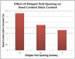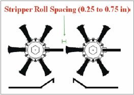 Stripper roll spacing – measured as the distance between adjacent bats or brushes turned to their inward- most position – should be as wide as possible without increasing field losses. Wider spacing between stripper rolls reduces the amount of foreign material collected and the potential for bark (Wanjura and Brashears, 1983; Brashears, 1986).