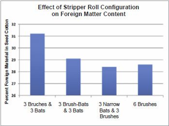Using fewer bats per stripper roll reduces the amount of foreign material harvested. Research showed that using a stripper roll configuration with one bat and five brushes reduced the total foreign matter content of stripped cotton (Brashears, 1992). Additionally, as stalks and branches become brittle late in the season after freezing weather, reducing the width of bats by 0.75 to 1 inch can reduce stick content by as much as 40% with minimal effect on harvest efficiency (Brashears, 1992; Supak et al., 1992).