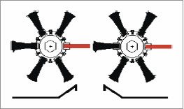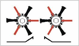 Conventional configuration of three bats (red) and three brushes on stripper rolls (rolls timed brush-to-bat).