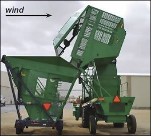 Harvesters are top-heavy and should be maneuvered slowly when full and unloaded on flat ground. Windy conditions are common in stripper-harvested areas and can cause harvesting equipment to roll over when unloading. Always pay close attention to wind direction when unloading in windy conditions and orient machines for unloading so that the basket rotates into the wind.