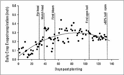 A typical 24-hour variation in the mass of a weighing lysimeter planted with cotton crop in Louisiana is illustrated in Figure 4.3. Figure 4.4 represents a water use (crop evapotranspiration) curve showing the seasonal water use characteristics of cotton at essential growth stages. Daily water use is expressed as a function of days past planting. Water use was observed to increase steadily from planting to first open boll and tended to decline slightly afterward. This suggests the need of maintaining well-watered field conditions until the first open boll. At about 60% boll opening, water use tends to substantially decline (Figure 4.3).