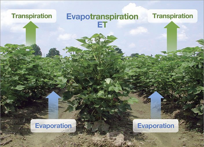 Figure 7.1 – Loss of water from a crop field during the growing season results primarily from evaporation from the soil surface, and transpiration through the plant leaves. These processes are termed “evapotranspiration” and commonly abbreviated “ET”.