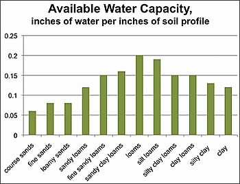 The water balance equation requires knowledge of the available water in the soil. Determination of subsequent soil water level is dependent on the initial soil water content. Soil water is dependent on the texture of the soil. Sandy soil has larger particles and pores that hold the water less tightly, reducing the soil available to plants. Conversely, clay soils have many, very small pores. The clay particles bind the soil water more tightly. While clay soils hold more water than sandy soils, less of the water is available to the plant because of the tight binding. Loamy soils have good pore space to hold moisture and do not bind the soil water tightly enough to prevent plants from extracting the water. These soils have more water available to the plant (Figure 7.2).