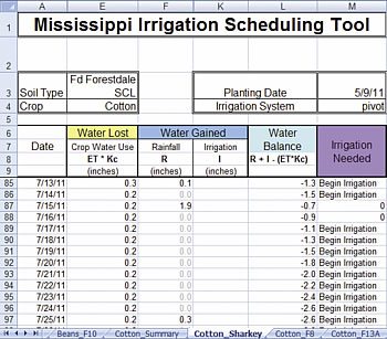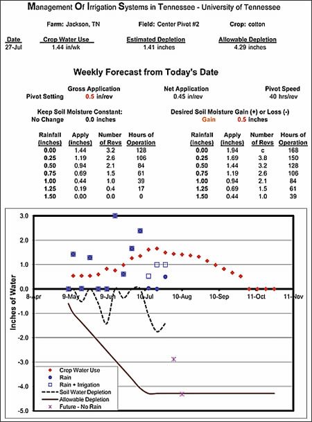 Most water-balance, irrigation-scheduling programs function in a similar manner, but the means of data input and the representation of the output can be very different. The Management Of Irrigation Systems in Tennessee (MOIST) program from the University of Tennessee requires weekly input of rainfall and irrigation instead of daily data. This is easier for producers to maintain and thus keep track of the needed rainfall and irrigation amounts. The approach works fine for the more drought-tolerant row crops that are grown in the good water-holding soils of West Tennessee; however, weekly input may not be adequate for water-sensitive crops grown in low water-holding soils like sands.