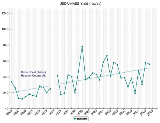 Figure 1. Cotton yield for Houston County, AL according to the USDA-NASS database.