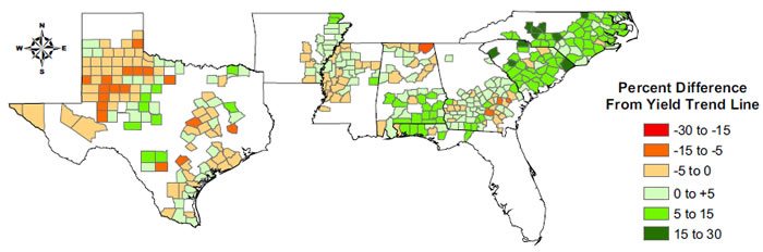 Figures 2 to 4 show average deviations from the yield trend line during neutral, El Niño, and La Niña years, respectively. From these figures it appears in neutral years, most states along the east coast and Alabama gulf coast experienced better than average yields, while Texas experienced below average yields, and yield were fairly typical in the mid-south states. Climate during neutral years is highly variable and results should be taken with caution. During El Niño years, areas in the southeast tend to have lower yields, while yields tend to be higher in the midsouth. In La Nina years, yields are reduced in both the mid-south and southeast states, with trends less clear in Texas. These results suggest producers may use climate forecast to adjust expected yield goals for the season. For example, a farmer in west Texas should expect above normal yields in an El Niño year and adjust fertilizer and seeding rates accordingly. Additional research is current under way to determine how significant the yield differences are during ENSO phases and what additional climate-derived indices can help predicting cotton yields.
