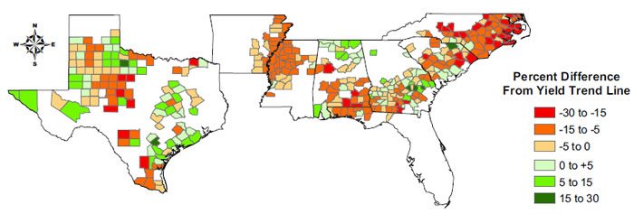 The analysis of potential ENSO effects on cotton yield was done by averaging yield variations (i.e., residuals) from the linear trend line for El Niño and La Niña years on a county-by-county basis. Residuals were defined as the percent difference of the observed yield from the expected yield (fitted line). A positive residual indicates a good crop year since the actual yield is higher than the trend line or, in another words, above the expected yield. On the other hand, negative residuals indicate below average or bad crop years. Maps of average residuals for both El Niño and la Niña years were created for each of the states studied. It is important to recognize that regional averages are a good indication of potential effects of ENSO phases but it does not provide the probabilistic information that is required when dealing with effects of climate variability on crop yield.
