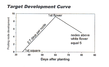 At first square, field stand counts and average first fruiting node number are recorded. From first square to first flower, ten plants at each of four sites in a field are monitored weekly for the presence or absence of first-position squares.