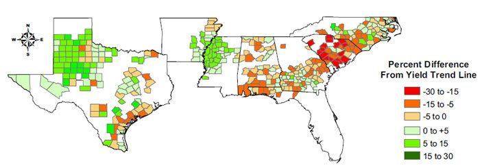 The analysis of potential ENSO effects on cotton yield was done by averaging yield variations (i.e., residuals) from the linear trend line for El Niño and La Niña years on a county-by-county basis. Residuals were defined as the percent difference of the observed yield from the expected yield (fitted line). A positive residual indicates a good crop year since the actual yield is higher than the trend line or, in another words, above the expected yield. On the other hand, negative residuals indicate below average or bad crop years. Maps of average residuals for both El Niño and la Niña years were created for each of the states studied. It is important to recognize that regional averages are a good indication of potential effects of ENSO phases but it does not provide the probabilistic information that is required when dealing with effects of climate variability on crop yield.